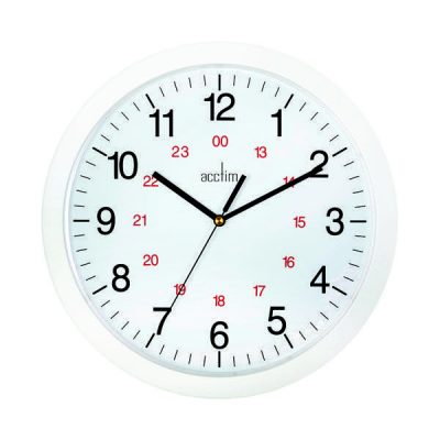 Ideal for workplaces that operate outside of the normal 9-5 routine, the Acctim Metro 24 Hour Plastic Wall Clock (21162) features an inner 24 hour ring. The thick hands, easily readable from across a room, are powered by a precision quartz movement. The inner red 24 hour track lets you work out 24-hour time at a glance. The 300mm white dial is surrounded by a matching white plastic trim. A plastic lens protects the clock face from damage or tampering.
