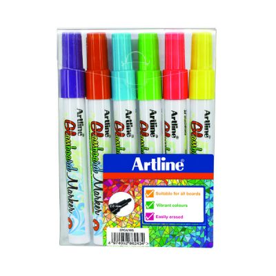 Choose an Artline Glassboard Marker when you want vivid, thick lines for eye-catching window displays. These markers feature a fine 2.0mm bullet tip for a consistent line width when writing or drawing. Made from strong acrylic fibre for long-lasting use, these markers contain a thick and dense ink for bright and vibrant writing on glass surfaces. The ink is also low odour for increased comfort when writing and can be simply erased with a wet or dry wipe. This pack contains 6 assorted markers in pink, orange, yellow, green, blue and indigo.