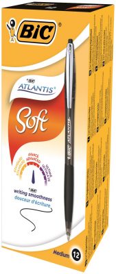 These Bic Atlantis Premium Ballpoint Pens feature Bic Easy Glide ink for smoother, more consistent writing. The medium 1.0mm tip writes a 0.4mm line width, perfect for everyday handwriting. The retractable pen also features a stylish curved barrel for comfort in use and metal pocket clip. This pack contains 12 black pens.