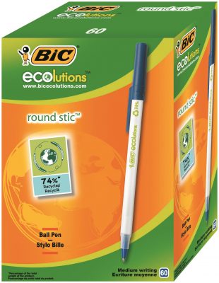 Bic Round Stic ECOlutions is a high quality, environmentally-friendly ballpoint pen for everyday use. It features an attractive slim-line barrel made with translucent plastic, including a clip for pocket storage, and quality blue ink for a smooth line. The medium 1mm tip provides a line width of 0.4mm, ideal for general handwriting use. The eco-friendly design includes 74% recycled material by weight for a more environmentally friendly ball point pen. This pack contains 60 pens.