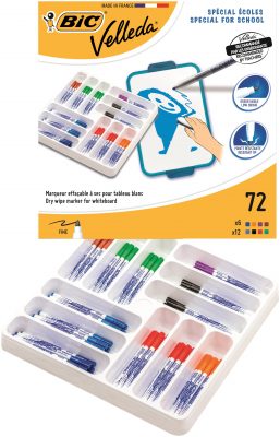 These Bic Velleda 1721 Drywipe Markers provide premium writing and sketching performance with your whiteboard. The alcohol-based ink glides on smoothly and erases just as easily, and is low odour. The markers feature a strong acrylic tip that won’t bend or retract into the barrel, even with heavy use. The fine bullet tip delivers a 1.4mm line width, perfect for small text and detailed whiteboard work. This bulk pack contains 72 markers in assorted colours.