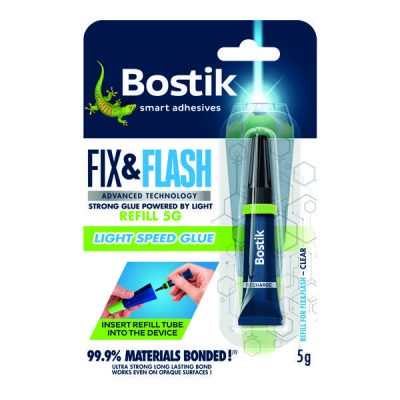For use with the Bostik Fix and Flash, this refill tube contains 5g of strong, instant adhesive, which is specially designed to work with the LED technology for a secure bond in 15 seconds. The refill is easy to insert into the applicator for economical, long lasting use. This pack contains 1 x 5g refill tube.