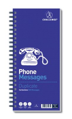 This handy Challenge telephone message book contains 80 pre-printed pages for easily recording and leaving messages. Each perforated sheet contains space to record 4 messages in carbonless duplicate with a white top copy and blue duplicate copy. The book is also wirebound, allowing it to lie flat for ease of use. This pack contains 1 telephone message book measuring 305 x 141mm.
