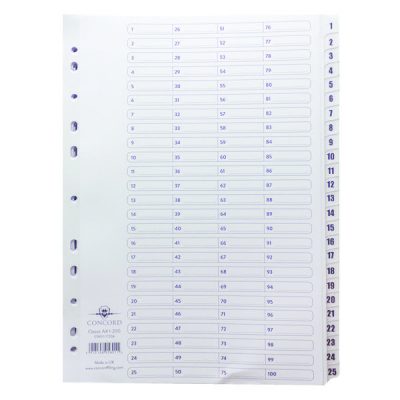 This Concord 1-200 Classic Index Divider is ideal for use in lever arch files and ring binders. Sized to A4 and hole punched, they offer you an easy way to archive and index your files and documents. With a pre-printed numerical indexing system and tabs numbered 1-200, it is easy to organise files for fast retrieval. Transparent Mylar reinforced tabs and punched holes help ensure long-lasting, tear-resistant durability.