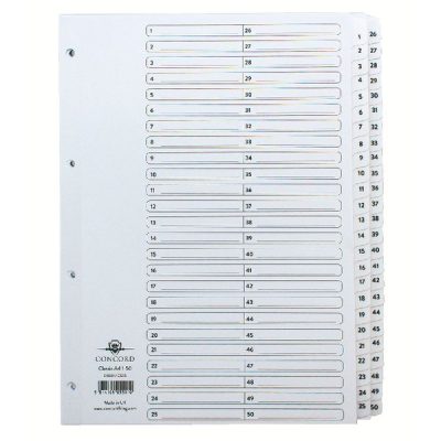 This Concord 1-50 Classic Index Divider is ideal for use in lever arch files and ring binders. Sized to A4 and hole punched, they offer you an easy way to archive and index your files and documents. With a pre-printed numerical indexing system and tabs numbered 1-50, it is easy to organise files for fast retrieval. Transparent Mylar reinforced tabs and punched holes help ensure long-lasting, tear-resistant durability.