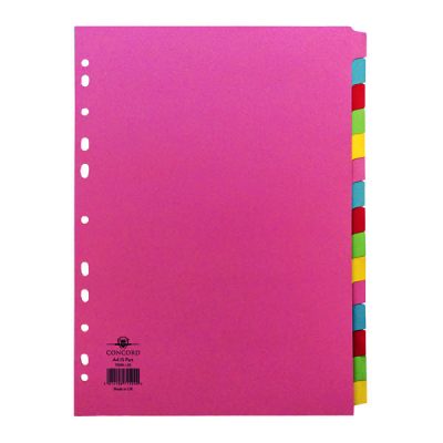 This Concord A4 15-part subject divider makes arranging and indexing your filing and presentations easier than ever. Multicoloured tabs separate documents into sections and are easily written or typed on for identification at a glance. These dividers are made of strong 160 micron board, making them the hard wearing and functional choice for students or businesses. Standard Euro punching fits almost any A4 ring binder or lever arch file.