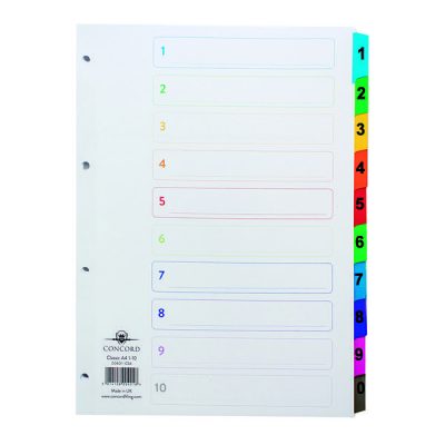 This Concord 10-Part 1-10 Multicolour Index provides numbered organisation to A4 lever arch files and ring binders. They offer a bright, colour-coded way to organise your documents with numbered tabs and a easy-to-use index cover. Each divider is made from strong board with Mylar-reinforced tabs and holes to protect against rips and tears. The tabs are numbered for quick access to the relevant section when looking up files. They’re 4-hole punched to fit most lever arch files and ring binders.
