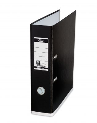 This Elba MyColour file features a standard lever arch mechanism with an 80mm capacity for filing A4 documents. Made from high quality polypropylene, the file has a reinforced bottom edge for increased durability and features a transparent spine label pocket and thumb hole for easy retrieval from a shelf. This black lever arch file has a white stripe along the bottom edge for colour coordinated filing.