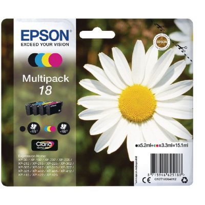 This Epson 18 multipack of cyan, magenta, yellow and black inkjet cartridges is for use with Epson Expression Home XP-30, 102, 202, 205, 212, 215, 225, 305, 312, 315, 322, 325, 405, 412, 415, 422, and 425 printers. The cartridges contain 3.3ml/5.2ml (colour/black) of ink for long lasting use.