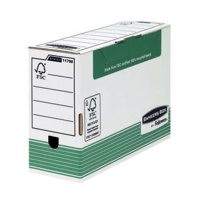 This Bankers Box transfer file features time saving Fastfold automatic assembly and a locking tab lid to help keep contents secure. Compatible with Bankers Box system storage boxes and filing units, the transfer file has a large 120mm spine width and can hold both A4 and foolscap documents. This pack contains 10 green and white transfer files measuring W120 x D360 x H255mm (internal dimensions).