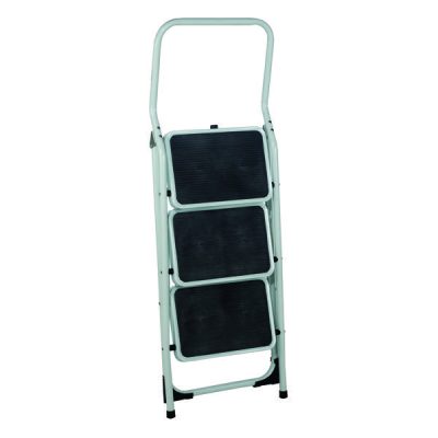 This convenient and high quality, 3 tread, aluminium step ladder has a tubular steel frame that is robust and strong, while the large, slip resistant treads provide added safety. This highly convenient step also folds away easily for quick and efficient storage. This step stool is finished in white and has a 700mm high top step.