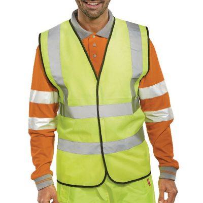 Improve safety and reduce the risk of accidents with a high visibility waistcoat to improve worker visibility in poor conditions. This large sized vest is designed to fit comfortably over work clothes and made from 100 percent polyester fabric with two body and two braces reflective bands. Easy to fasten, even with gloved hands, with simple Hook and Loop fasteners, this vest conforms with EN ISO20471 for Class 2 for intermediate level visibility. Medium size.