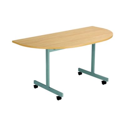 This economical mobile flip-top table has a hard-wearing MFC top and silver legs with black castors.