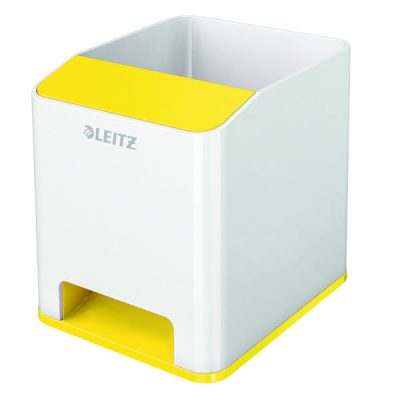 Keep pens, pencils, and other stationery tidy with this innovative pen holder that features an extra compartment for smartphones up to iPhone 6 Plus in size. This compartment has a sound booster function, which increases the volume of your phone whilst keeping your smartphone screen completely visible when placed inside. This pen holder also features a stylish metallic dual colour scheme with high gloss finish. This white/yellow pen holder measures W90 x D101 x H100mm.