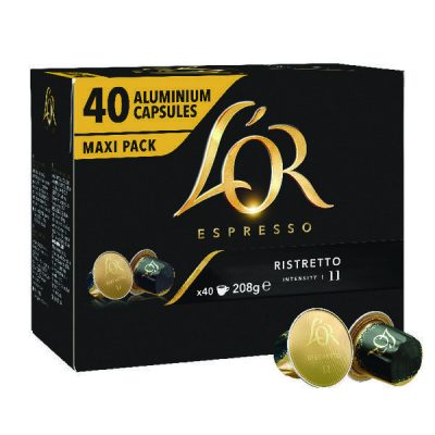 Compatible with Nespresso coffee machines, these L’Or Ristretto capsules create a nutty and complex espresso with an intensity rating of 11. Bolder and with a fuller body than the traditional espresso, the ristretto features a strong, fragrant aroma with a less bitter taste. This bulk pack contains 40 ristretto capsules.