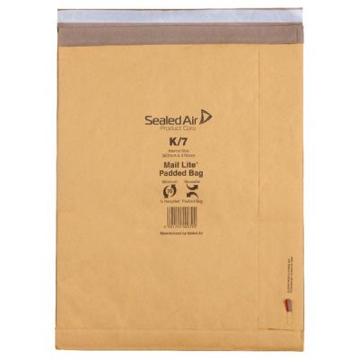 This Mail Lite padded postal bag is tough, reusable, 100% recyclable and made from 100% recycled content. Ideal for mailing delicate or fragile items, the bag also features a simple, secure peel and seal closure and a convenient easy open tear strip. This K/7 bag measures 365 x 476mm. This pack contains 50 gold postal bags.