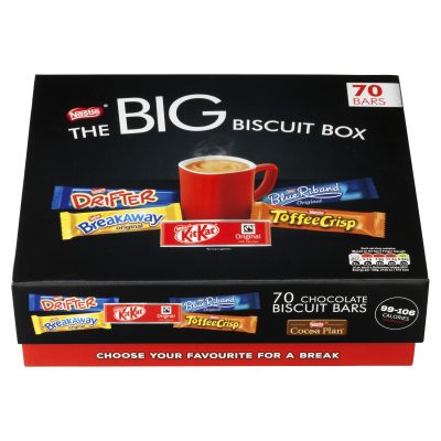 Treat the rest of the office to this irresistible selection box of Nestle chocolate biscuit bars. Including Breakaway, Blue Riband, Yorkie, Kit Kat and Toffee Crisp, this box is an ideal addition to your break time snacks at work. Choose your favourite for the perfect break with a delicious cup of tea or coffee, and your workday stress will soon disappear. This pack contains 71 chocolate biscuit bars.