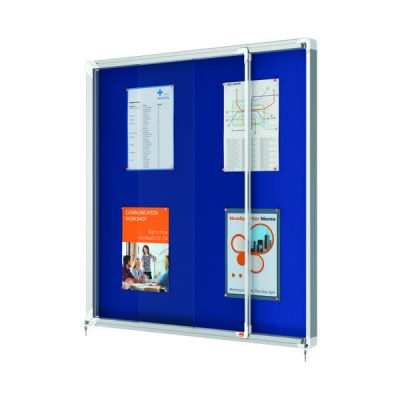 Felt lockable notice board with sliding glass doors and unobtrusive integrated corner lock. Complete with a modern stylish aluminum trim and fixed with a rail and through corner wall mounting. Excellent felt notice board surface to securely pin and display your notices. Size: 12xA4 sheets.