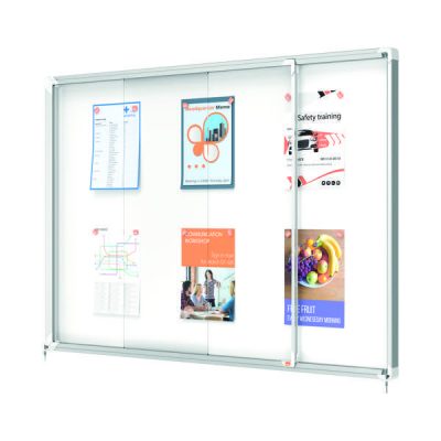 Magnetic lockable notice board with sliding glass doors and unobtrusive integrated corner lock. Complete with a modern stylish aluminum trim and fixed with a rail and through corner wall mounting. Excellent magnetic notice board surface to securely display your notices. Size: 18xA4 sheets.