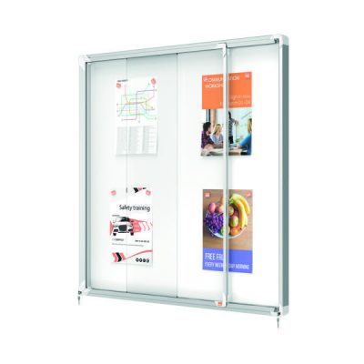 Magnetic outdoor weatherproof lockable notice board with a hinged glass door and side lock. Complete with a modern stylish aluminum trim and fixed with a through corner wall mounting. Excellent magnetic notice board surface to securely display your notices. Size: 12xA4 sheets.