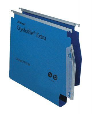 These tough Rexel Crystalfile Extra lateral files are made from durable polypropylene and are designed to last up to 5 times longer than manilla files. With a wipe clean satin finish, the file features an extra long, linkable tab for convenient filing. With a bar length of 275mm, each file has a 30mm capacity and can hold up to 300 A4 sheets. This pack contains 25 blue lateral files and comes with tabs and printable inserts.