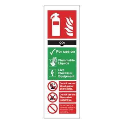 This sign details safe applications for carbon dioxide fire extinguishers. Simple to understand, using recognisable symbols and a universal colour scheme, this sign keeps employees, customers and visitors informed in the event of a fire. This self-adhesive sign measures 300 x 100mm.