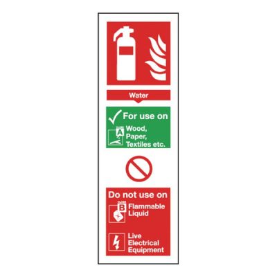 This sign details safe applications for water fire extinguishers. Simple to understand, using recognisable symbols and a universal colour scheme, this sign keeps employees, customers and visitors informed in the event of a fire. This self-adhesive sign measures 300 x 100mm.