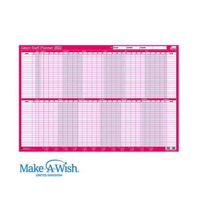 The Sasco Staff Planner is ideal to plan your staff holidays, meetings and training days. The specially designed planner shows a full calendar year with a Monday-Friday working week. Space for up to 40 names makes it ideal for tracking staff availability during the working week. The unmounted planner is laminated with a write on, wipe off surface for any changes required. This planner measures W915 x H610mm Help change the lives of children with critical illnesses. Choose Sasco and support Make-A-Wish. This year, Sasco planners are donating to Make-A-Wish UK. Together, we create life-changing wishes for children with critical illnesses.