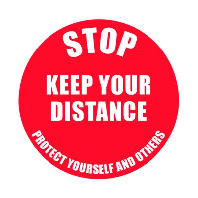 Industrial strength floor markers designed to help combat the spread of Coronavirus. These premium quality, 235mm wide, highly visible floor signs are printed onto the underside of a clear PVC film and laminated on the back surface with permanent adhesive. Suitable for use on dry, flat, clean surfaces, they are anti-slip laminate surface tested to R9 standard. This circular marker displays the text ‘STOP KEEP YOUR DISTANCE/PROTECT YOURSELF AND OTHERS’.