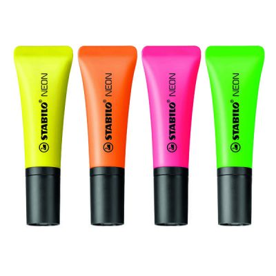 These innovatively designed Stabilo NEON highlighters feature a unique soft tube design for comfortable use. The bright neon ink has the same anti-dry out ink formula as other Stabilo highlighters and the colours will not fade on the page. The chisel tip produces a 2.0 – 5.0mm line for neat underlining and bold highlighting. This pack contains yellow, orange, green and pink.