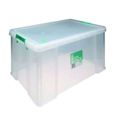 These heavy duty, stackable boxes provide a tough and durable storage solution for the office home or warehouse. The base and corners are reinforced for extra strength and durability, making them ideal for long term storage. The storage box can be stacked with or without the included lid for versatile use. The lid also includes location guides for non-slip, secure stacking. The box also contains handles, which clip the lid in place and make transportation easier. This extra large capacity 70 litre box can accommodate a wide variety of items for versatile storage.