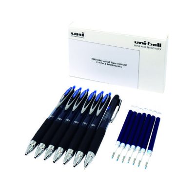 The Uni-Ball Signo UMN-207 retractable rollerball helps you create perfectly smooth handwriting with water resistant, fade resistant and tamper-proof Super Ink. With a rubber grip for comfort. This pack includes 7 fully working pens and 7 additional 0.7mm nib refills. This convenient, all-in-one package is an easy way to go green. Simply use the pens and then refill. Pens and refills contain blue ink.